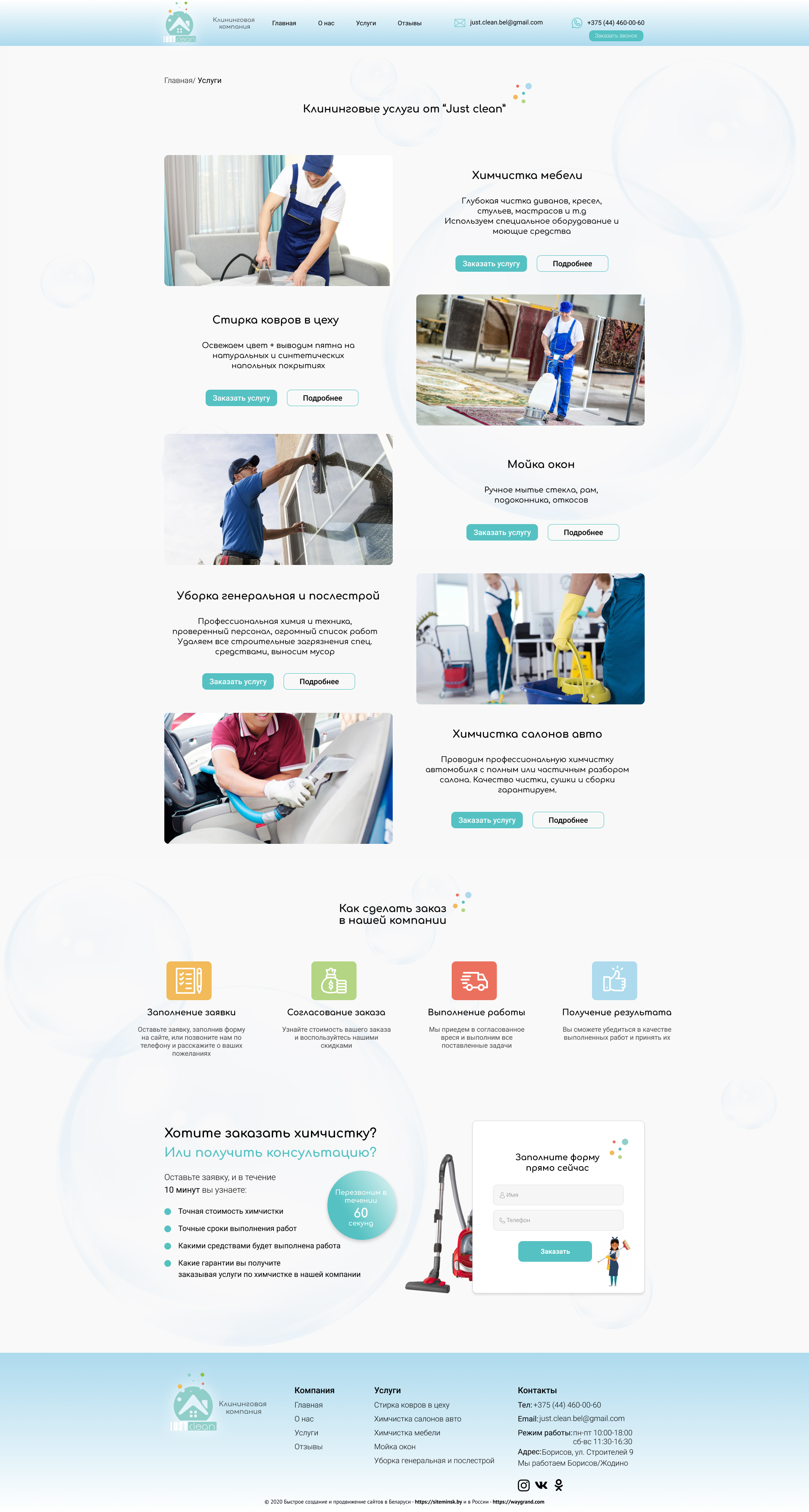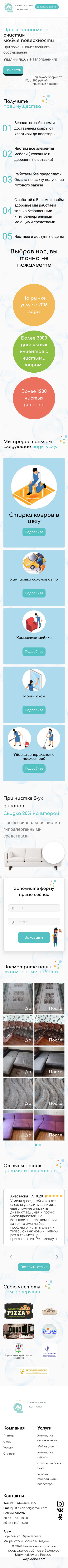 Закажите готовый продающий сайт визитка #237 в Борисове за 5-7 дня «под ключ»: свёрстан, отрисован и готов к рекламе. Тематика шаблона «Клининговая компания».